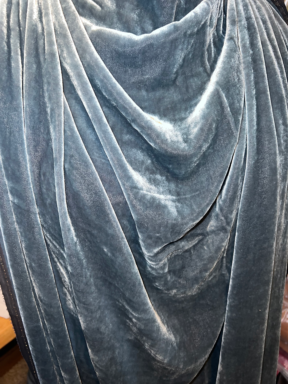 I combined the front and side fronts of the simplicity pattern into one piece and cut the front out as such on a fold, since theres no seam lines on the front of the reference. I combined the patterns on an old bed sheet to make it one bug pattern piece. I did have to add a small welt on the sides of the dress to splice in since the velvet was too narrow to fit the whole patterns width.